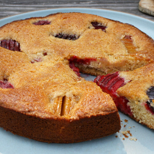 • Pour the batter into the lined and greased cake pan. Add the sliced plum on top of the cake. They will sink as they bake.